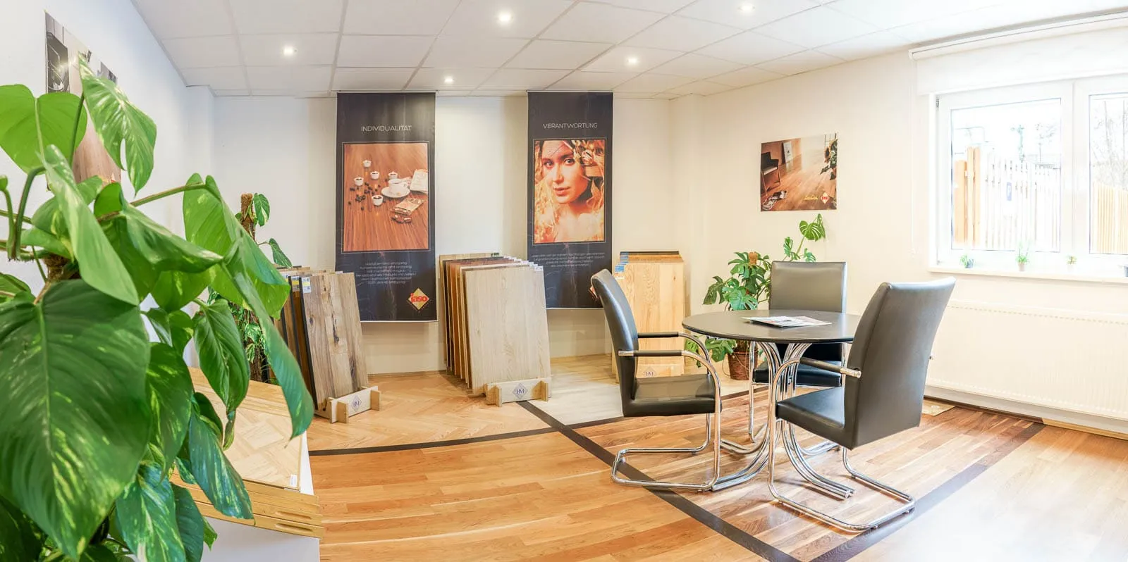 Der große Ausstellungsraum mit Parkettverlegung in verschiedenen Holz- und Verlegearten und umfangreichem Mustersortiment aller weiteren zu verlegenden Bodenbelägen – außer Fliesen – wie Laminat, Linoleum, Vinyl, Teppich u.a. ermöglicht eine ausführliche und individuelle Beratung.
